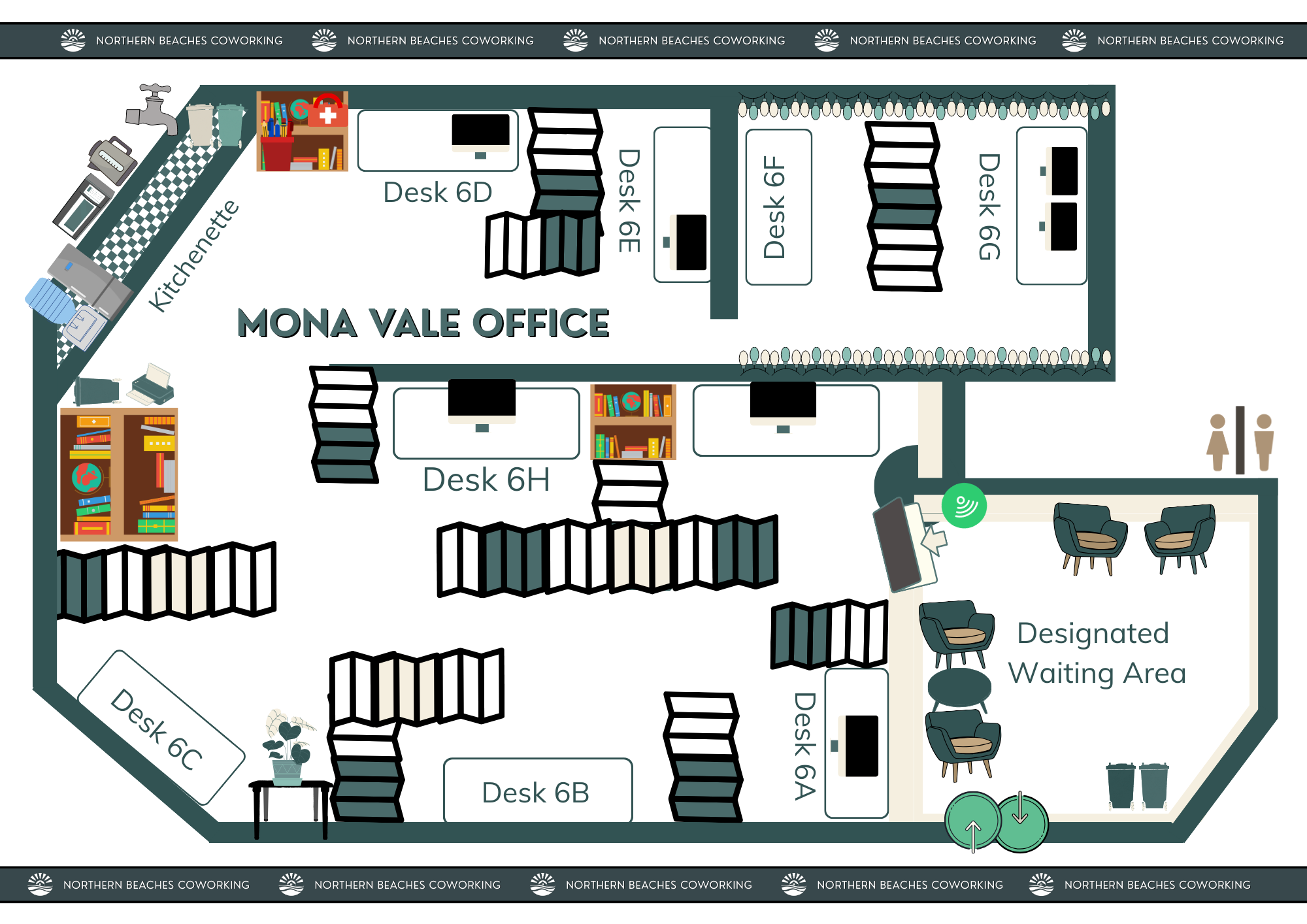 Professional coworking space in Mona Vale on Sydney's Northern Beaches peninsula. Hot desks and reserved desks with monitors, WiFi, and flexible daily or monthly plans.